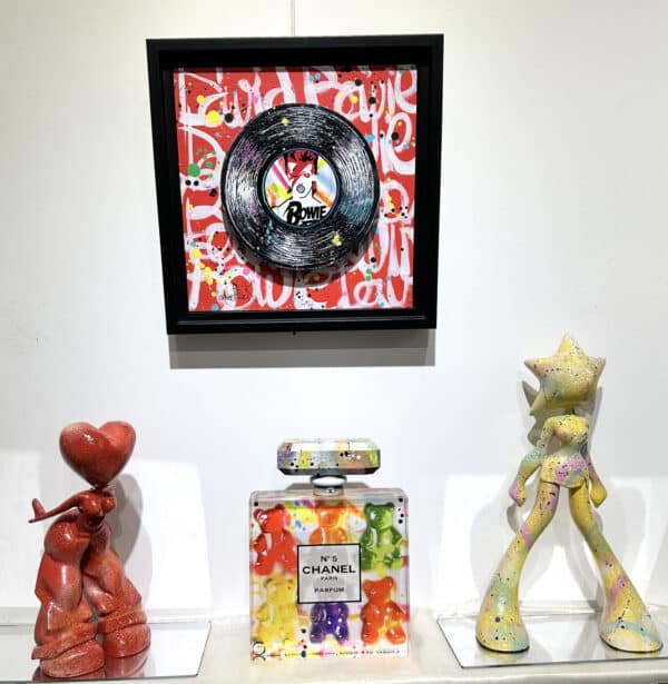 Original pop art work on framed canvas, depicting a black vinyl record in relief with a stylised portrait of David Bowie on a red graffiti background splattered with bright colours.