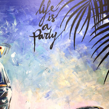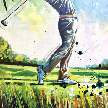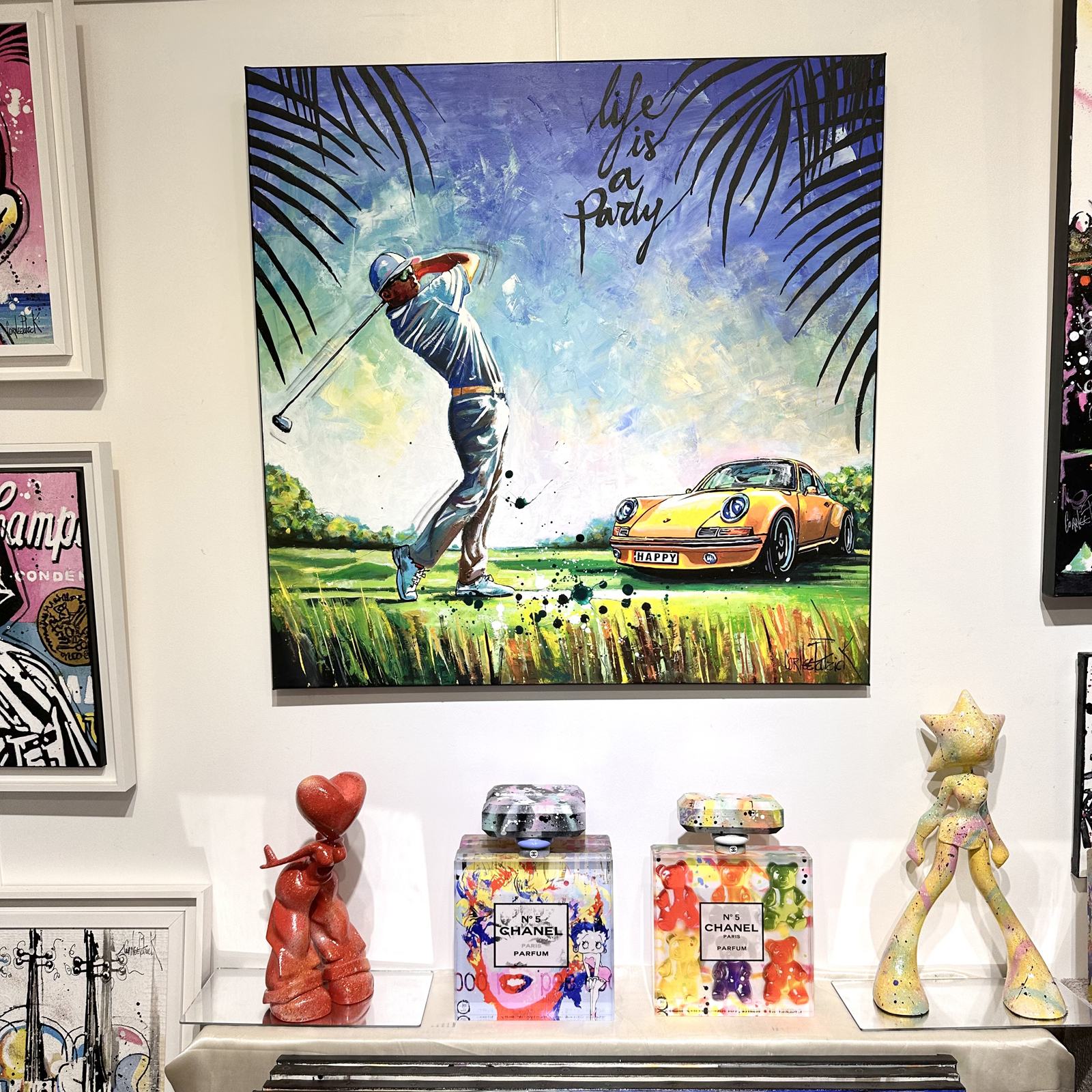 Original artwork on canvas, depicting a golfer in full swing on a tropical green with a yellow Porsche.