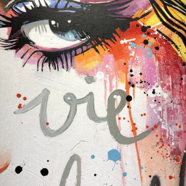 Contemporary pop art portrait of a woman with an intense gaze, vibrant colors and red lips, featuring the handwritten text ‘la vie est belle’. Original acrylic painting on canvas, urban and modern style, perfect for bold and colorful wall decor.