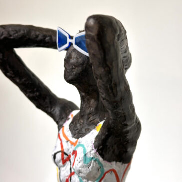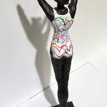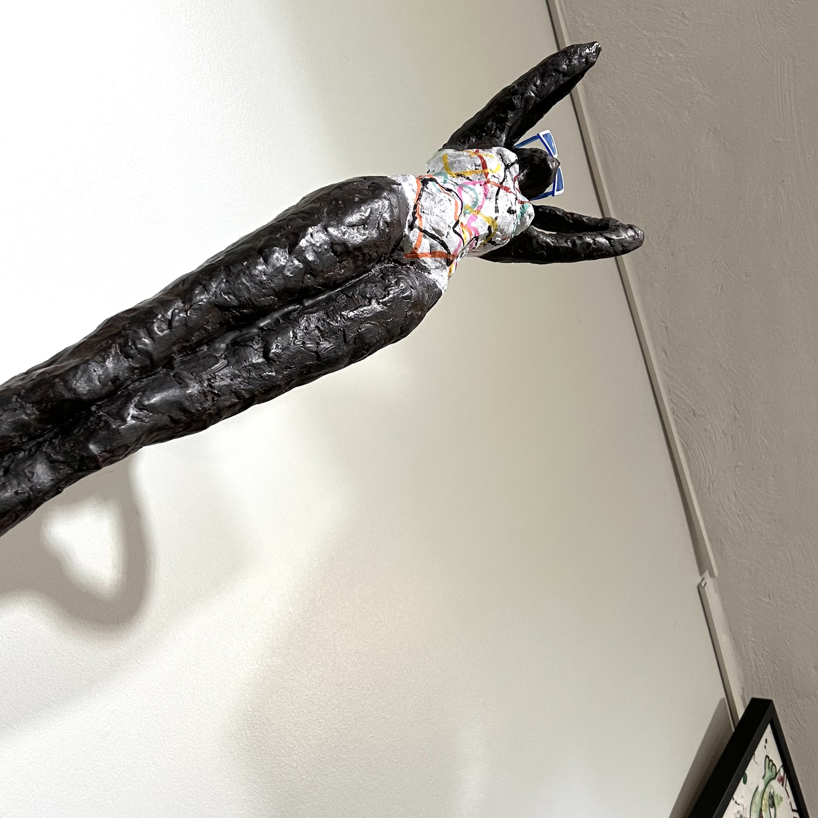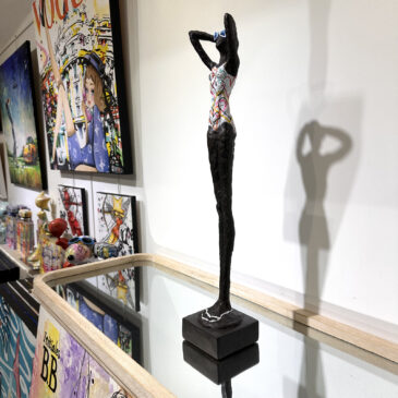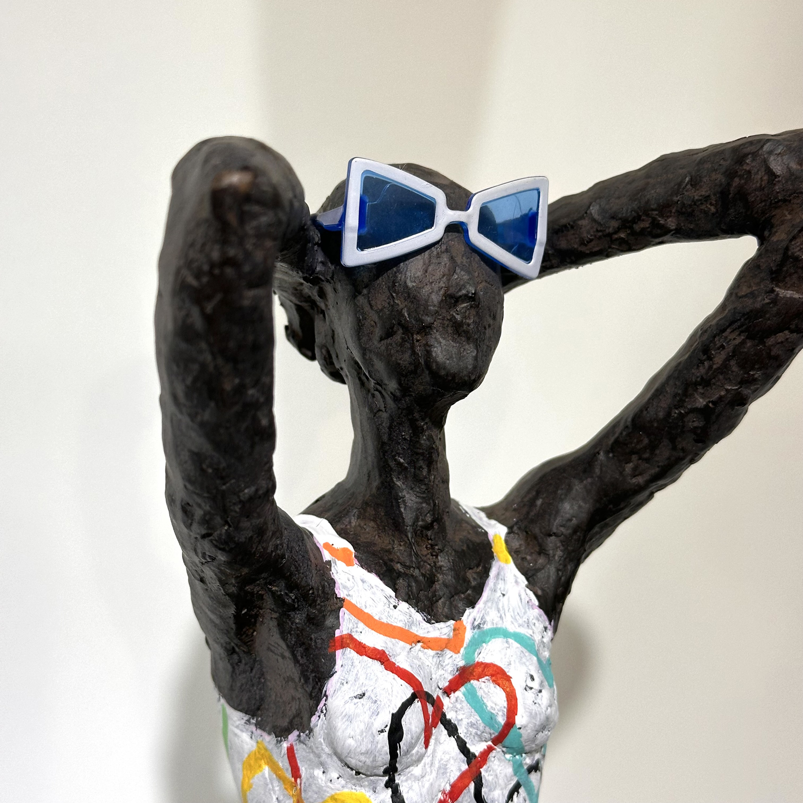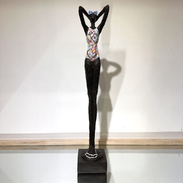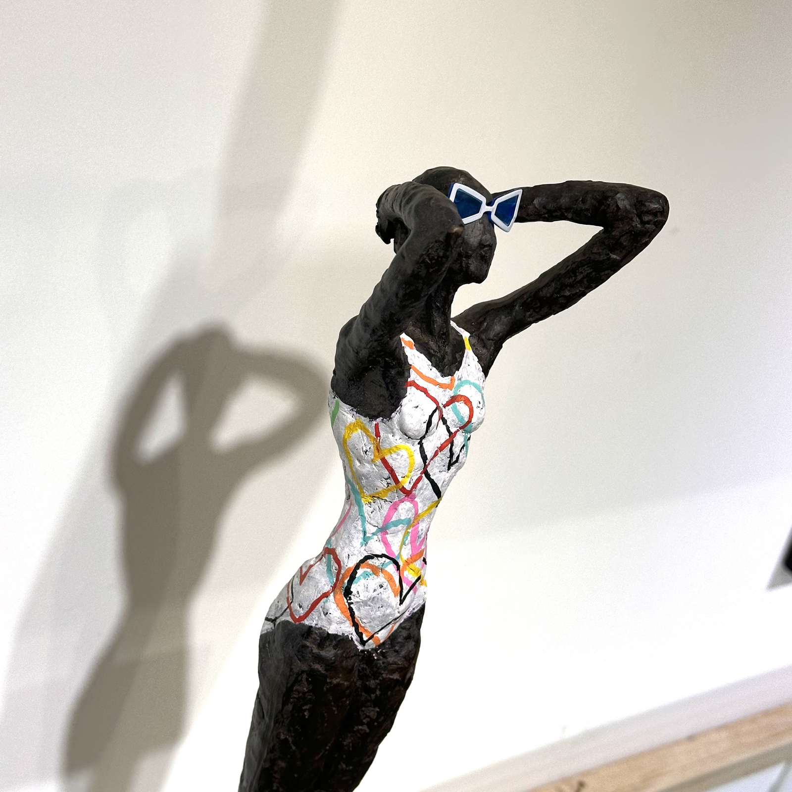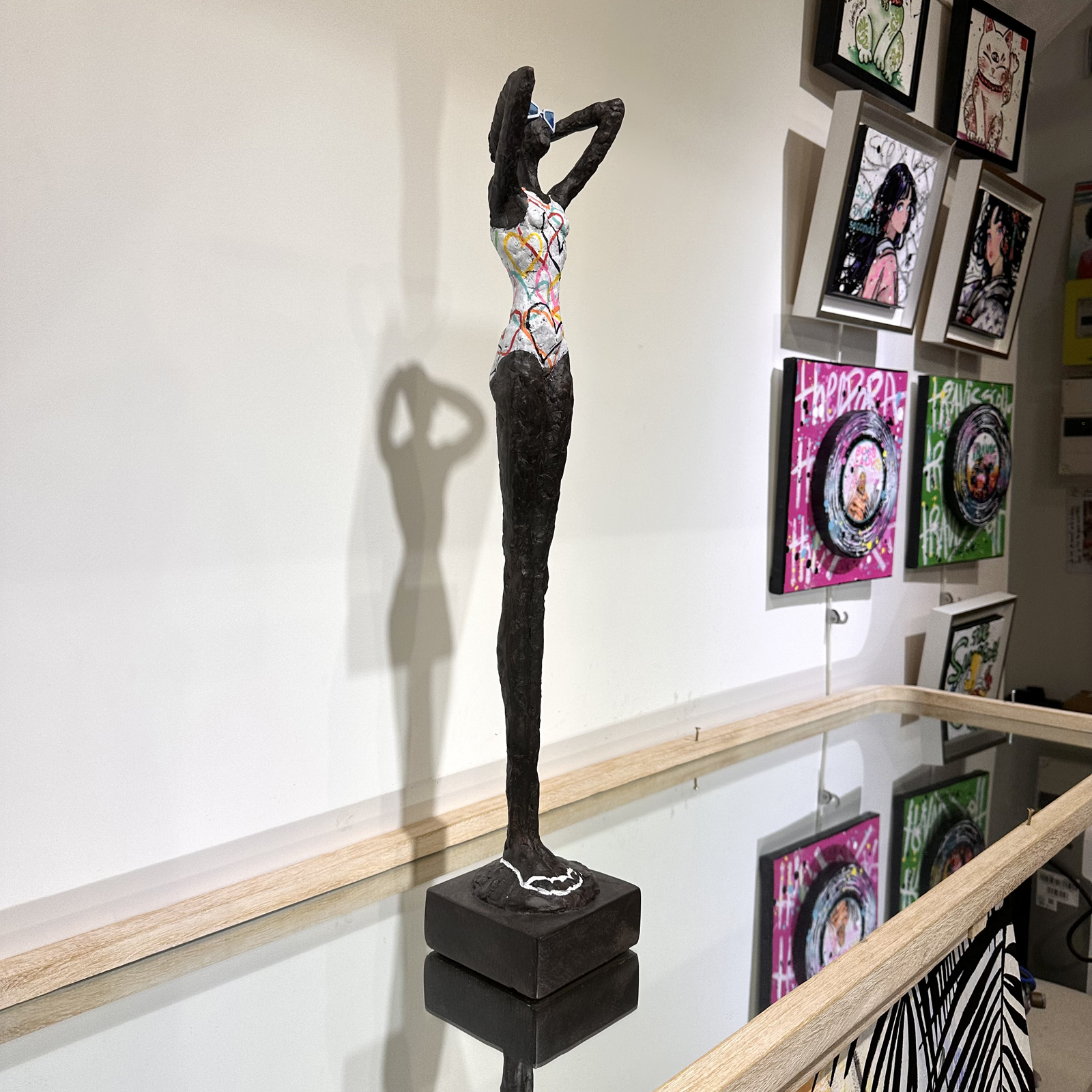 Sculpture moderne en résine style Giacometti représentant une femme élancée en maillot de bain, entre élégance fashion et art minimaliste.