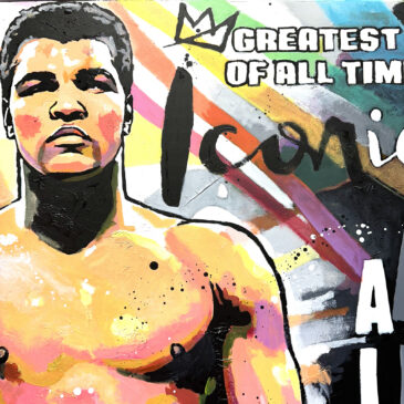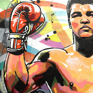 Portrait original de Mohamed Ali, huile sur toile, peinture unique de style pop street art aux couleurs vives, idéale pour une décoration contemporaine.
