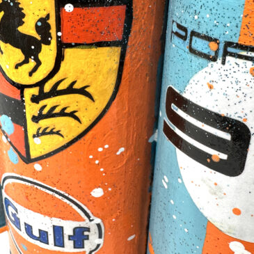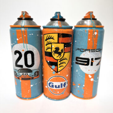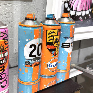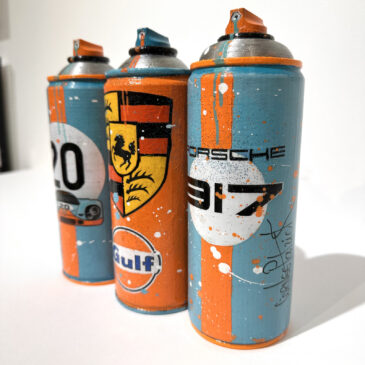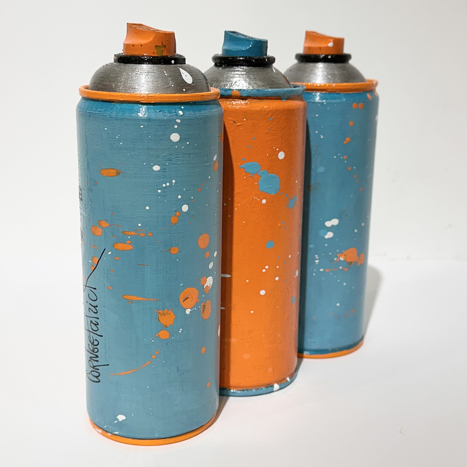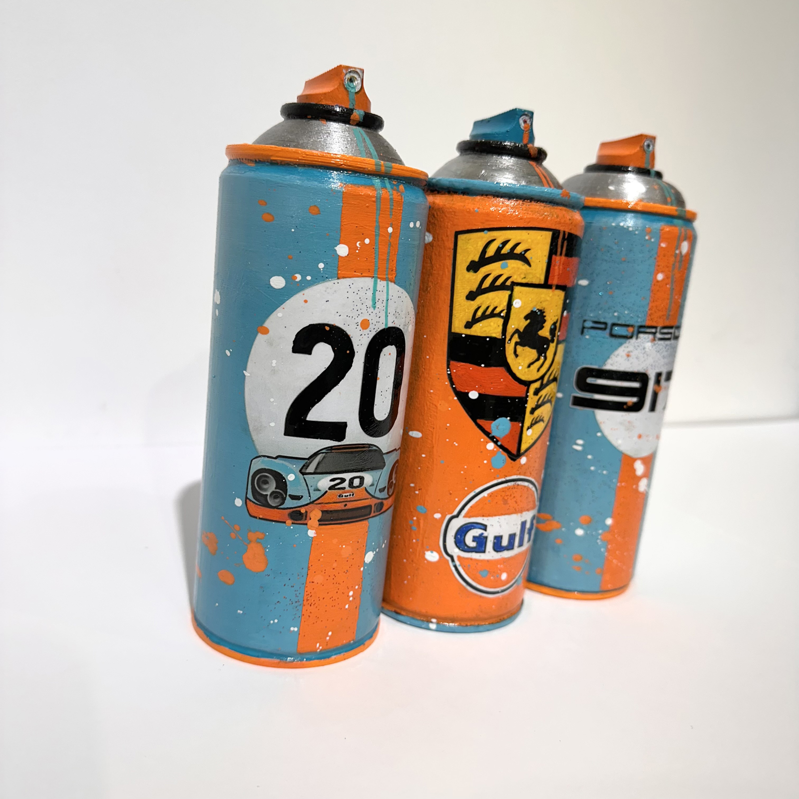 Sculpture pop art en résine, trio de bombes de peinture référence à Steve McQueen et aux Porsches couleurs vives et éclaboussures street art
